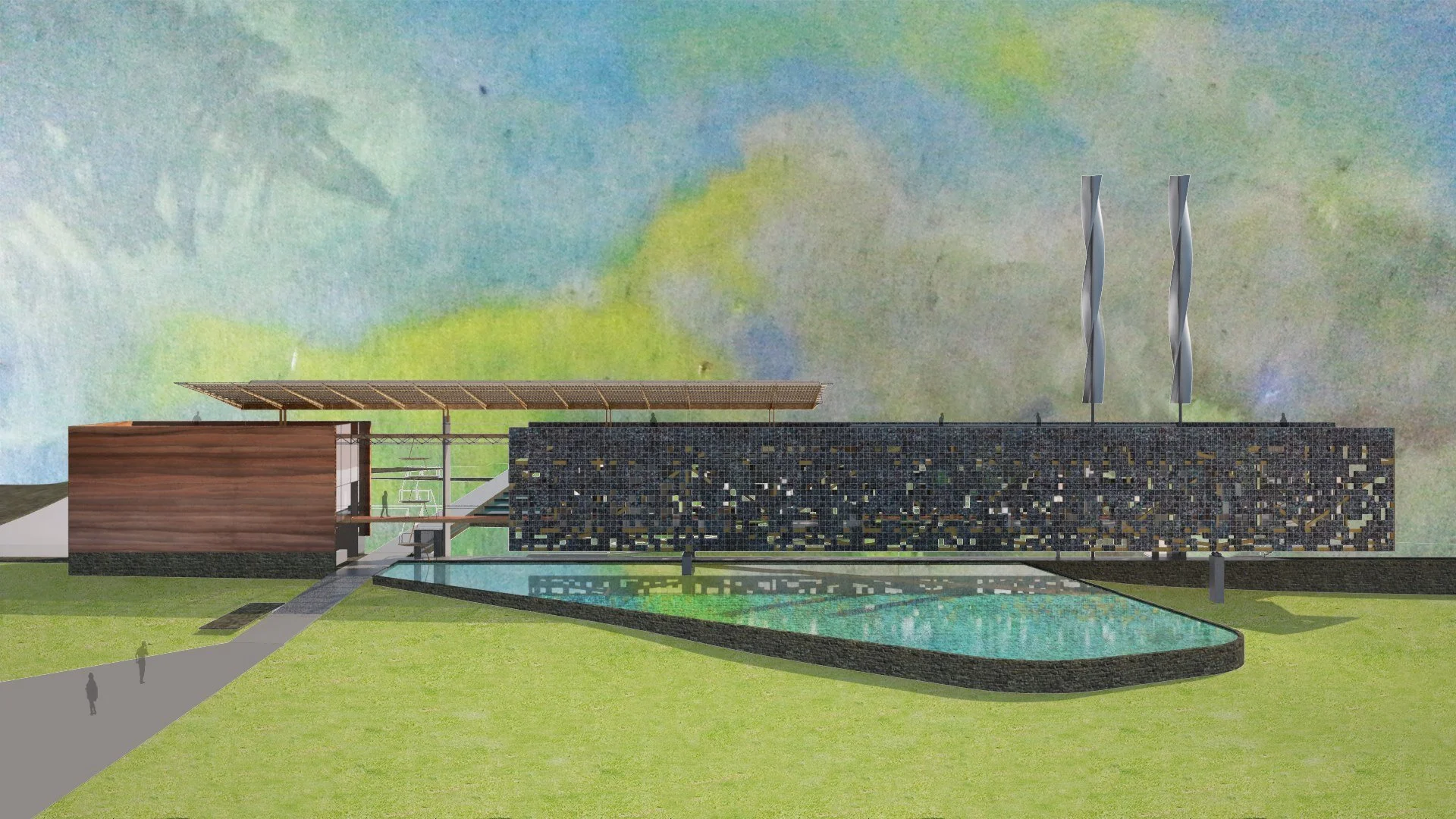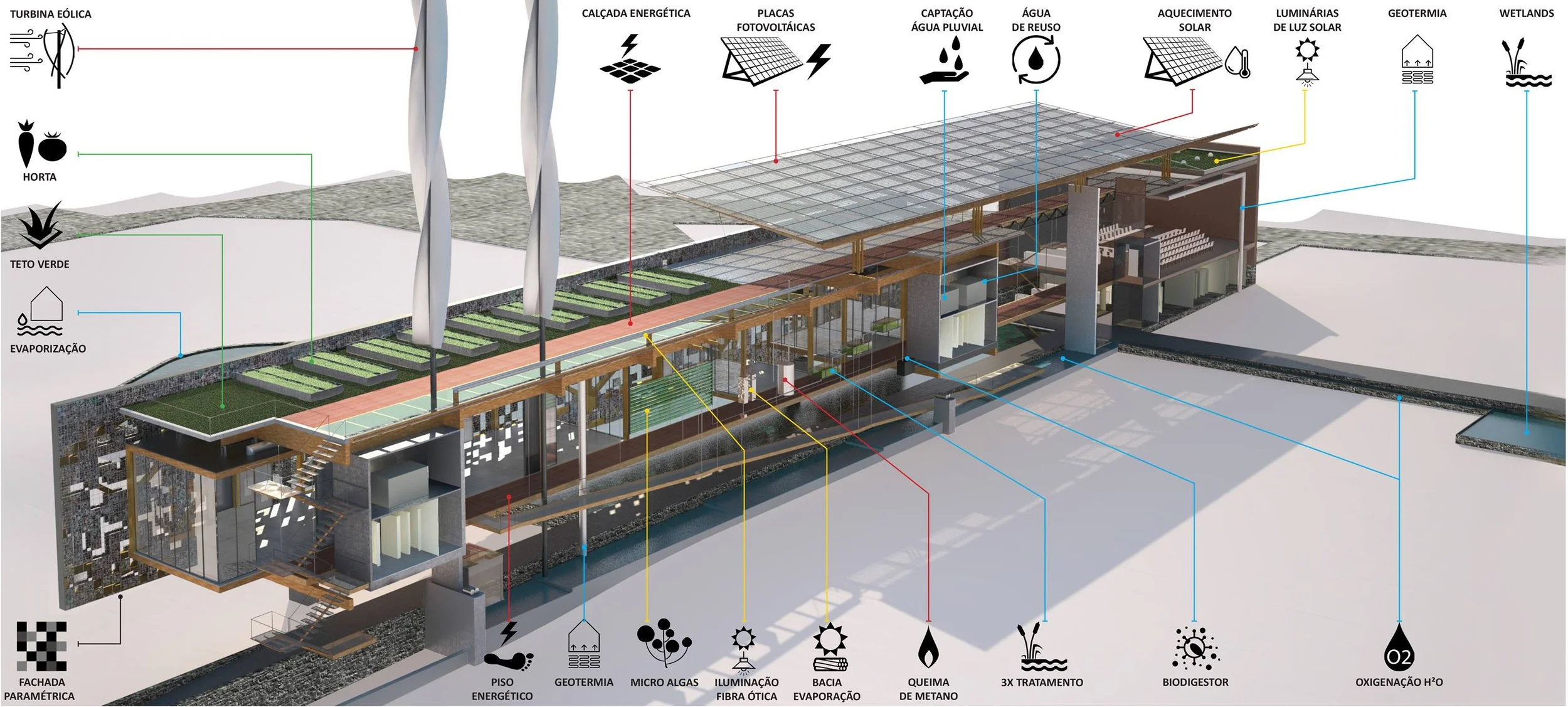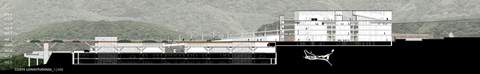 O partido configura-se por meio da Estação de Transferência, formada por um ‘teto jardim’ permeado por vazios, que conecta todo o complexo: estação, estacionamentos, plataforma de embarque do trem, hotel, salões de exposições, restaurante, lanchonete, café e centro de convenções. O percurso desenhado para os passeios turísticos toma a suave rampa que desce da plataforma de trem para um museu a céu aberto com informações e dados ecológicos da região; a Praça do Trem que acompanha espelhos d’água, lojas e bicicletários; o Pavilhão do Café; e o deck para o vale do Rio Cabeça que dá acesso à lanchonete sob o pavilhão. Continuando, chega-se ao Instituto Chico Mendes.