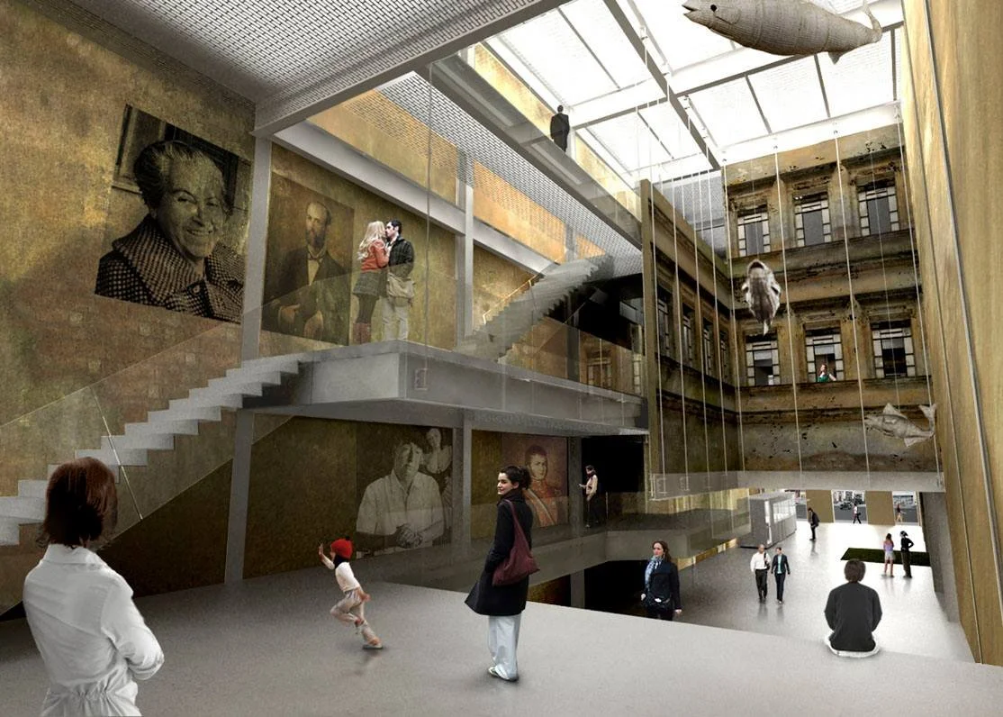 Para isto, utilizaram-se dos pátios existentes, definidores do volume do edifício, para o desenho destes vazios, como grandes poços de luz. A materialidade e o aspecto geral do edifício, que denunciam o acúmulo do tempo, são preservados. Uma nova estrutura metálica é proposta, integrando-se ao conjunto existente, e por vezes, suspendendo as antigas alvenarias para liberar o saguão no térreo.
