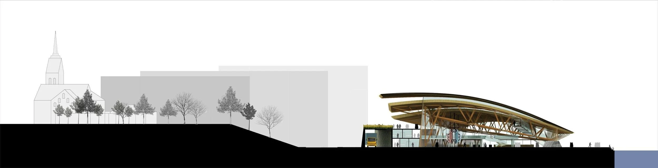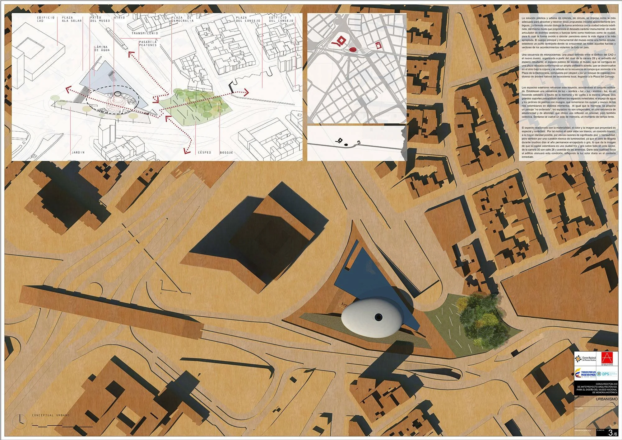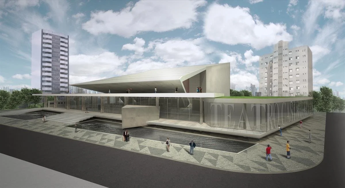 O projeto atende à recomendação de conceituar a proposta de intervenção em três níveis: REQUALIFICAÇÃO, REDISTRIBUIÇÃO e AMPLIAÇÃO. Além disso, a implantação das reformas deverá seguir um cronograma de etapas que permita o funcionamento do NTCA ininterrupto, garanta a sua exeqüibilidade, e proporcione um caminho de parceria, onde o programa colocado pelo edital se complete pela arquitetura. Duas estratégias são fundadoras do partido: a preservação da integralidade volumétrica do edifício pré-existente e a construção de uma nova topografia envoltória – em extensão do território da cidade – com a ordenação de seus fluxos a partir dos acessos e a comunicabilidade de suas funções. Surge uma placa que intercepta o volume do teatro e amplia, em um jardim suspenso, a cota pública urbana. Ocupam-se os espaços negativos fortalecendo a idéia de uma cobertura geradora de sombra. Fica estabelecida assim a permeabilidade física e funcional entre a construção existente e a nova que se tornam um único organismo com circuitos diferenciados: o técnico – que articula os espaços funcionais atuais com os propostos – e o público – que garante aos visitantes a fruição pelas galerias expositivas.