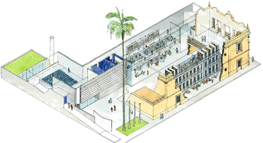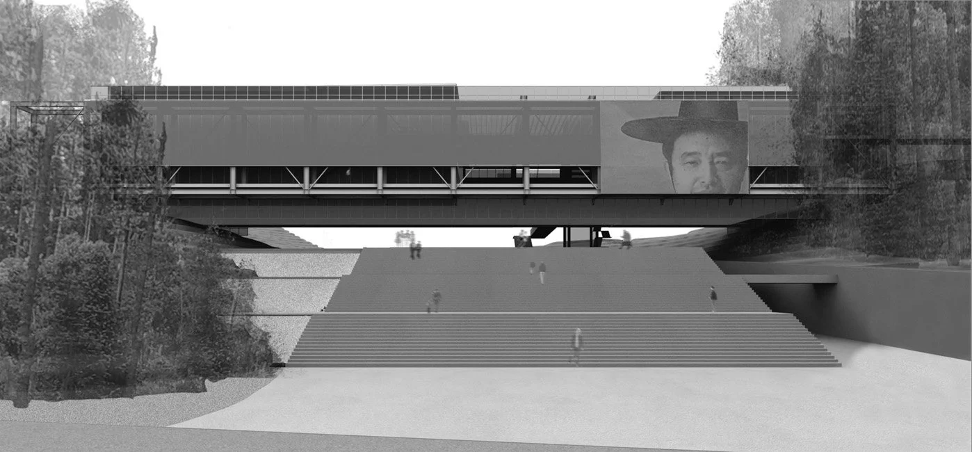Procurando conciliar os aspectos subsequentes relativos ao programa arquitetônico/museológico e sua inserção no terreno, percursos internos e de conexão entre edifícios do Neighborhood Park, bem como diversos outros aspectos técnicos e funcionais, nos damos conta de que a ponte, enquanto partido arquitetônico, apresenta uma quantidade enorme de vantagens em relação a outras possibilidades. A ponte é também uma solução de impacto ambiental controlado, dado que se sustenta com apenas quatro pontos de apoio e permite uma desejável transparência para o edifício, em face do entorno e do verde.